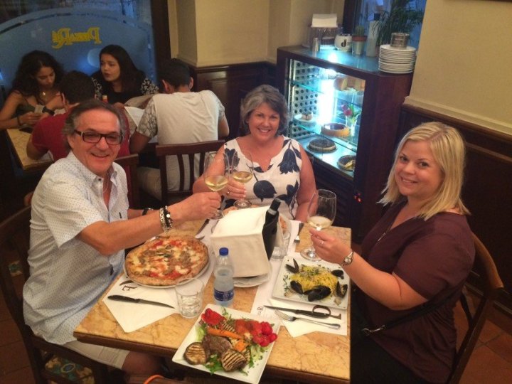 An isolated electrical storm delayed our train back to Rome so Peter, Carolyn and I walked back into town and enjoyed some traditional porchetta with cold beers along with much conversation.